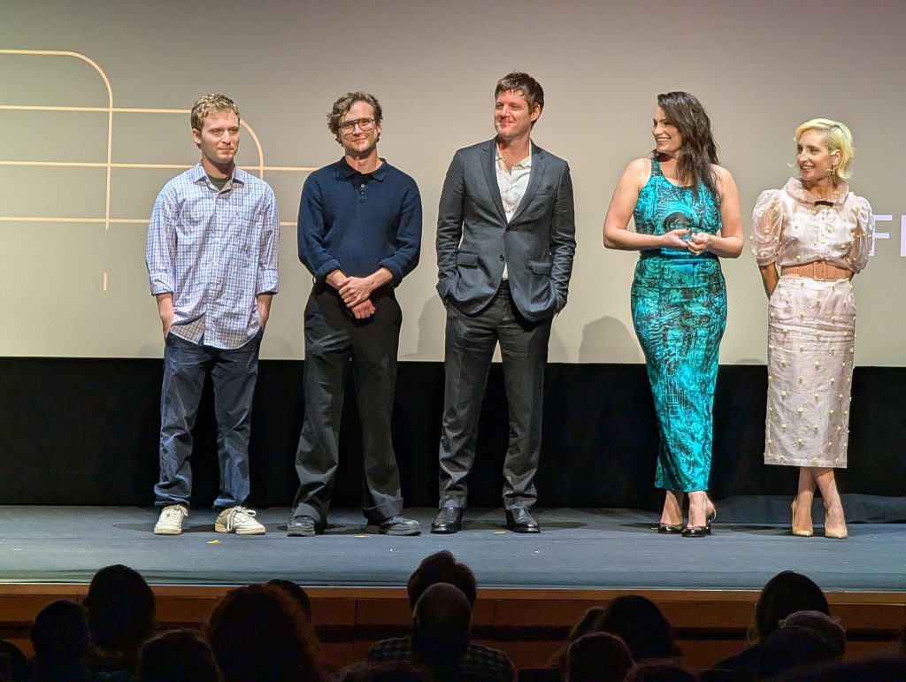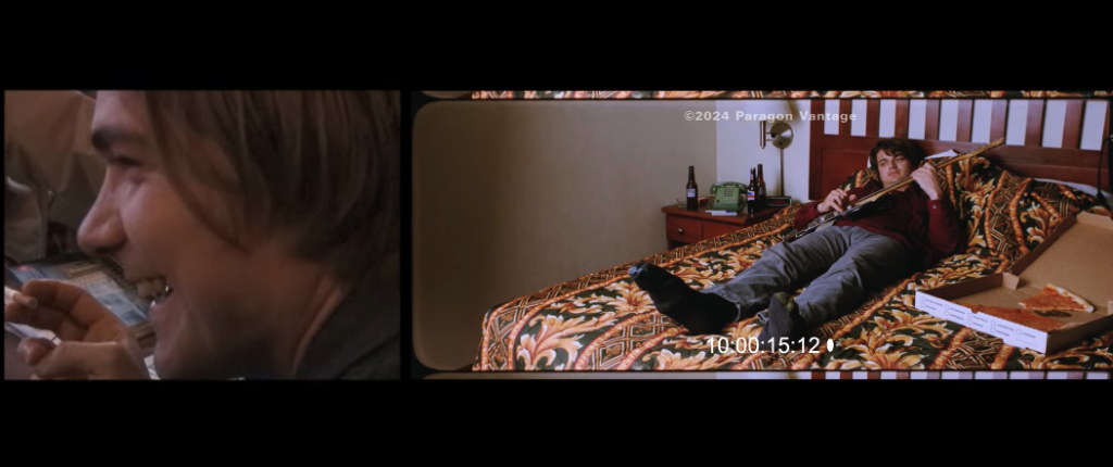 From there, the movie basically becomes a mosaic, often using split screen to cover the movie’s five threads (six if you include the making of the biopic, which Perry also includes). Just in case that still seems too normal, half the movie is also a mockumentary. (The NYFF program guide called it a “sorta-documentary). Perry is filmed creating the musical, Slanted! Enchanted!, as a pretentious theater director, while the cast’s experience with Pavement ranges from them being longtime fans to finding out about them within the last few weeks. The bulk of the film’s humor, however, comes from the biopic, Range Life. Perry made his disdain towards these kinds of movies known during the Q&A, and it’s on full display here. I won’t spoil some of the best jokes, but suffice it to say, he was pretty spot on. The cast of the film-within-a-film is great and includes Fred Hechinger, Griffin Newman, and Nat Wolff as members of the band, while Tim Heidecker and Jason Schwartzman portray the executives of Matador Records. The real scene-stealer, however, is Stranger Things’ Joe Keery as lead singer Stephen Malkmus. Playing himself, he believes he’s bound for Oscar gold for this part, and all I’ll say is that he gets a bit too involved trying to get into the role.