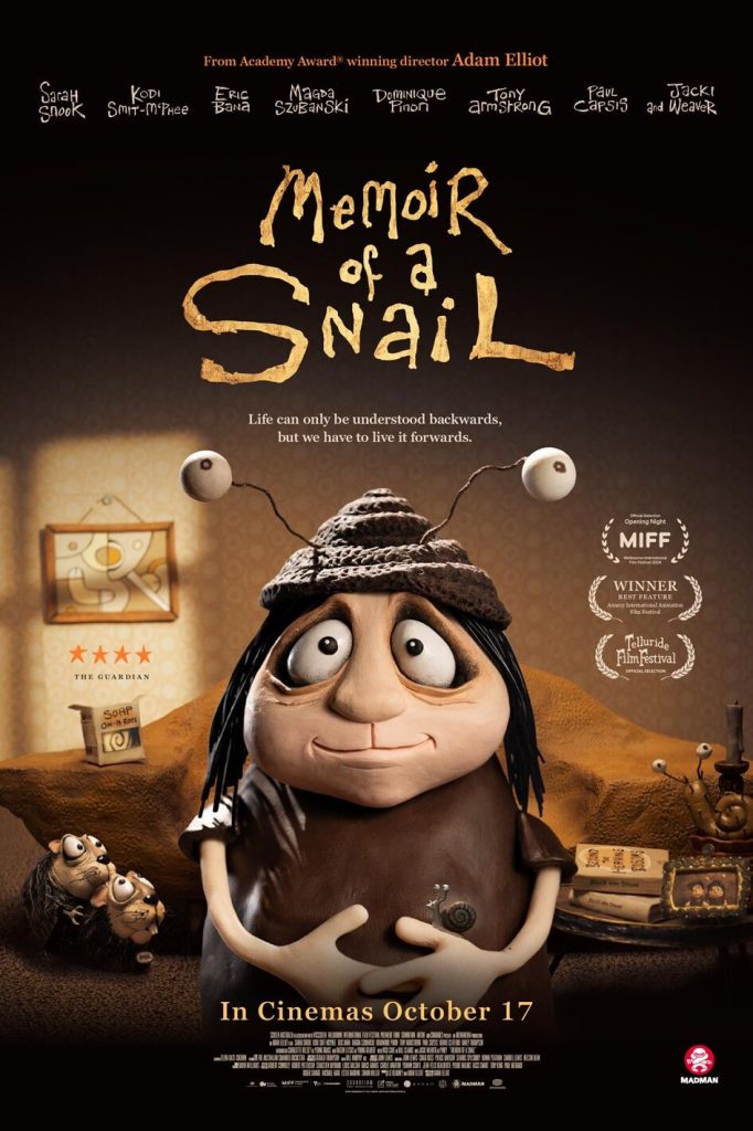 Memoir of a Snail is rendered in Elliot’s trademark offbeat stop-motion style, which favors imperfect edges and shapes, and I still find it charming and unique. It’s sort of like watching an alternative comic come to life in three dimensions. In an age of CGI, it’s rare to see a movie where everything is lovingly hand-crafted. The voice acting is superb, with Jackie Weaver’s Pinky being a highlight. As Grace, Sarah Snook (Succession) nails the part, bringing the emotional weight of the character through her voice work. (For fans of Nick Cave, he also has a role.) As for any issues I had, there were parts of the story I definitely saw coming, and the ending I felt could’ve been handled a tad better, but I felt those were minor relative to the film overall.