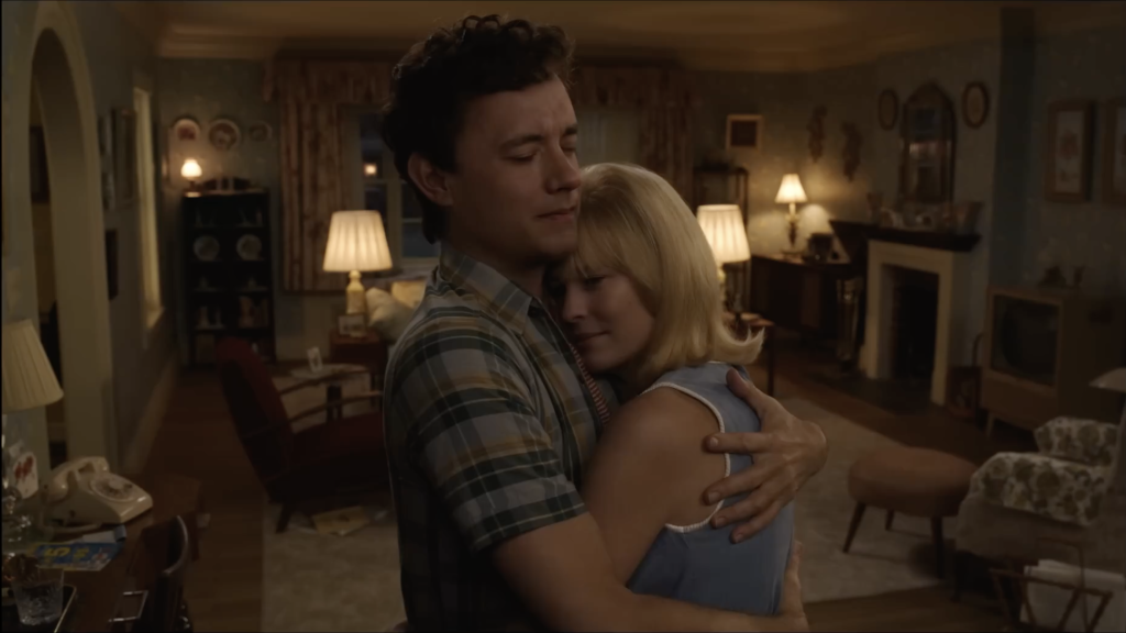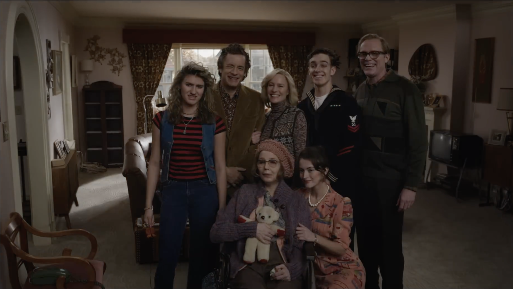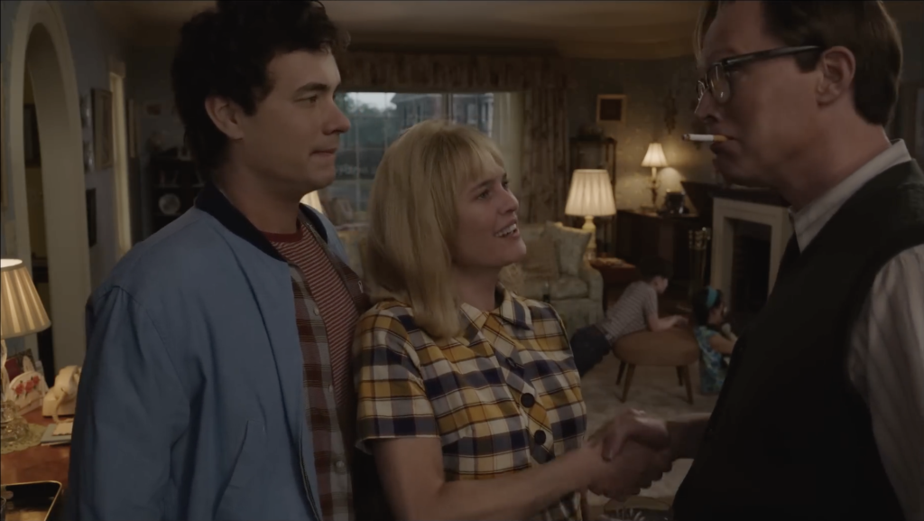 The story of Here is about a place and the people that inhabit it. The camera stays still but the scenery changes, starting during the age of the dinosaurs, and moving ahead to Native American peoples, colonial times, the 1800s, the entire 20th century, and the early 21st century to the present. A house is built, and a number of key players arrive to inhabit it. There’s an early airplane pilot and his wife and daughter. Then they’re replaced by an inventor and his wife, the former of whom may have stumbled on the perfect invention at the perfect time. However, once they leave, the primary focus of the story begins, as Al (Paul Bettany) and his wife Rose buy the house after World War II and start a family. Later, one of their sons, Richard (Tom Hanks), meets Margaret (Robin Wright), who becomes his girlfriend. He later marries and has a daughter with her, Vanessa. From there, much of the film follows the trials and tribulations of the family throughout the ensuing decades, all against the backdrop of what occurred before them and what will happen after.