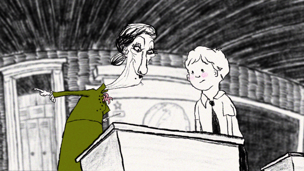 Actor Kate Siegel is mainly known for her work in horror. The short she directed, Lily, is a more family friendly take on the genre, even with the fact that it was written by Stephen King. Told in scratchy, Edward Gorey-esque pencil art, a young boy needs to go to the bathroom but is embarrassed in front of the class by his sadistic teacher. When he finally gets there, he makes a frightening discovery. I absolutely loved the animation for this, and the story is really fun.